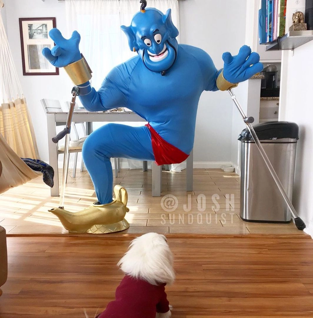 Сандквист каждый год в течение десяти лет наряжается на Хэллоуин в невероятно крутые и оригинальные костюмы, в которых отсутствие ноги всегда выступает главной фишкой. В кого только не перевоплотился Джош за эти годы. Он был Джинном из мультфильма «Аладдин», пряничным человечком, подсвечником и даже знаменитой настольной лампой из заставки мультипликационной студии Pixar.