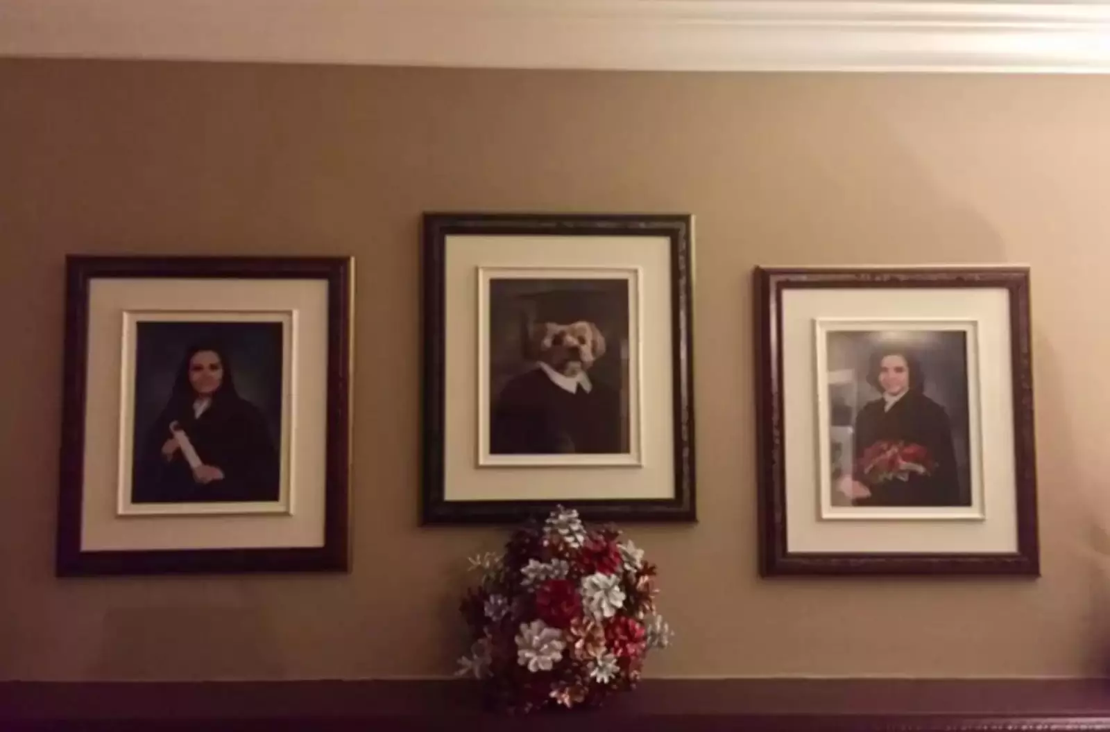 «Моя сестра Оливия решила тайно сделать для Йоги снимок выпускника. Затем, пока никого не было дома, она заменила одно из наших старых детских фото на новую смешную фотографию Йоги», — рассказала Памела Дюфрен изданию The Dodo.Чтобы сделать забавный выпускной снимок пёсика, Оливия несколько часов возилась с ним в Photoshop, но усилия того стоили: Йоги на фото выглядит просто превосходно и точно заслуживает места над каминной полкой между своими двуногими сестрами.