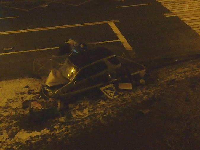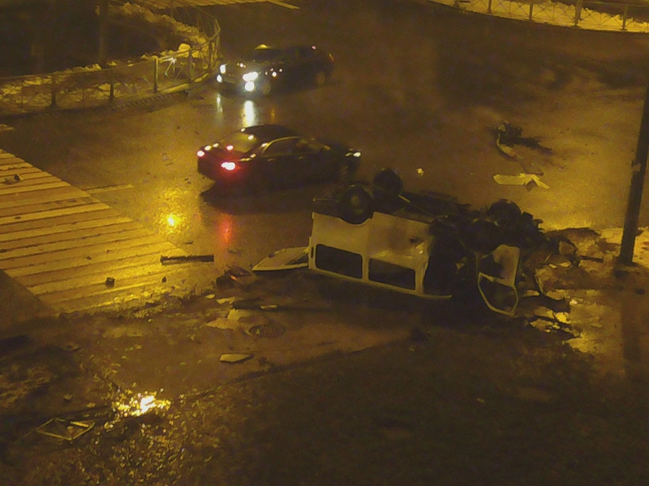 ДТП произошло на перекрестке Искровского проспекта и улицы Подвойского около 6 часов утра. Очевидцы отмечают, что мчащийся на большой скорости Mercedes врезался в поворачивающий минивэн.