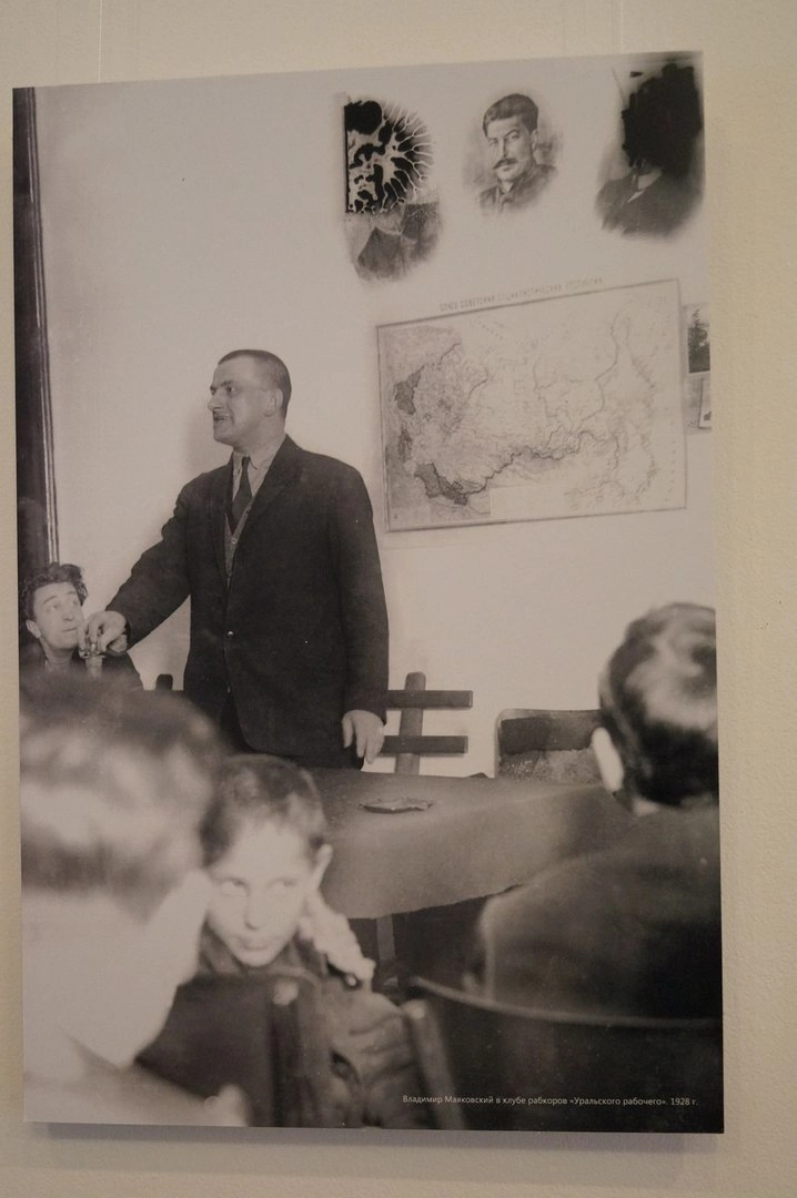 Итак, представьте себе, старейшему изданию Екатеринбурга в этом году исполняется уже 107 лет! Не хило. Вот и решила редакция газеты в сотрудничестве с музеем Метенкова организовать историческую экспозицию. Здесь представлены некоторые газетные номера от времен царской России и до нашего времени. В свое время В «Уральском рабочем» публиковались Троцкий, Зиновьев, Бухарин. Да, это те, кто был рядом с Лениным, когда тот кричал что-то с броневика. Поэт Владимир Маяковский отправил несколько своих стихотворений в «УР». Кстати, вот он на одном из заседаний редакции.