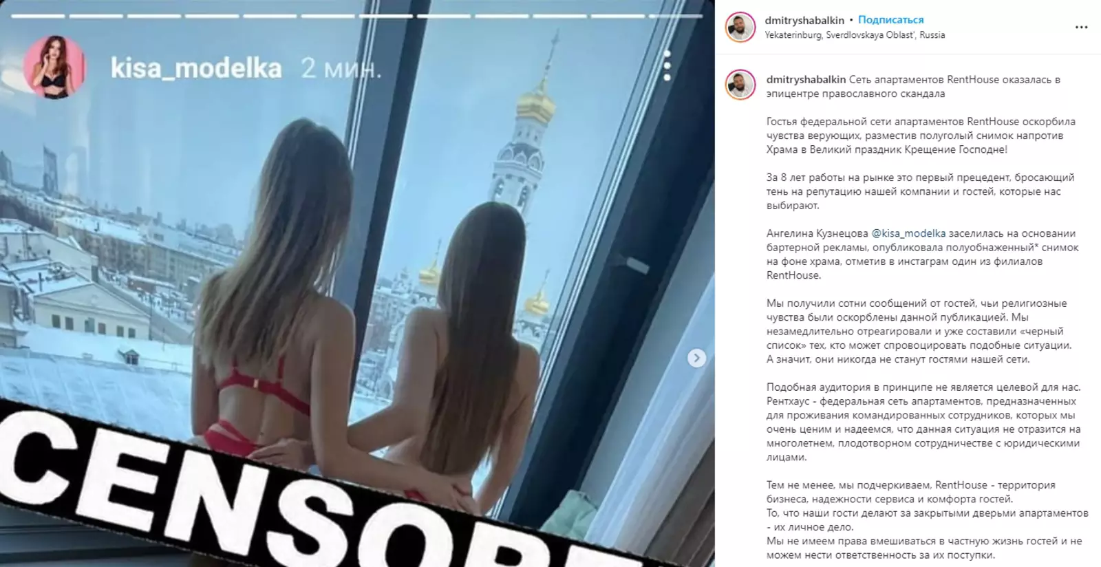 Дмитрий Шабалкин — владелец екатеринбургского отеля сети RentHouse, в котором было сделано скандальное фото полуобнаженной модели Ангелины Кузнецовой на фоне храма «Большой Златоуст» — сообщил «Ридусу», что не считает себя виноватым в поступке, который многие считают оскорблением чувств верующих.