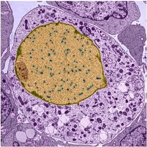 Частицы вируса в ядре поражённого раком белого кровяного тельца