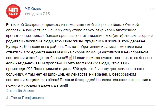 Участники сообщества «ЧП Омск» согласились, что подобные ситуации в регионе происходят достаточно часто. А в одном из населенных пунктов после жалобы на платную скорую и вовсе закрыли медпункт.