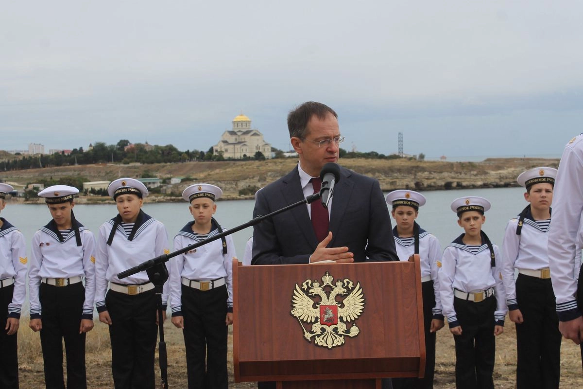 В самом мероприятии уже ощущался некий дореволюционный флер. На фоне купола храма Херсонеса навытяжку стояли курсанты местного военного училища и воспитанники кадетского корпуса, одетые в форму матросов. Неподалеку в качестве почетных гостей под моросящим севастопольским дождем собрались представители местной власти: врио губернатора Михаил Развожаев, глава местного парламента Владимир Немцев, а также два сенатора от Севастополя Екатерина Алтабаева и Валерий Куликов. Из-за их спин, немного стесняясь, периодически выглядывал «народый мэр» Алексей Чалый, которого служба протокола почему-то поставила во втором ряду.