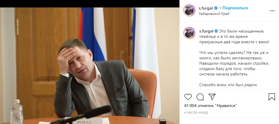 Отправленный в отставку по указу президента бывший губернатор Хабаровского края Сергей Фургал опубликовал на своей странице в Instagram прощальный пост. Он назвал жителей региона «сильными духом людьми», а также поблагодарил как за поддержку, так и за критику.
