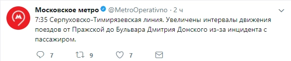Из-за инцидента были увеличены интервалы движения поездов от станции «Пражская» до станции «Бульвар Дмитрия Донского», сообщается в Twitter метрополитена.