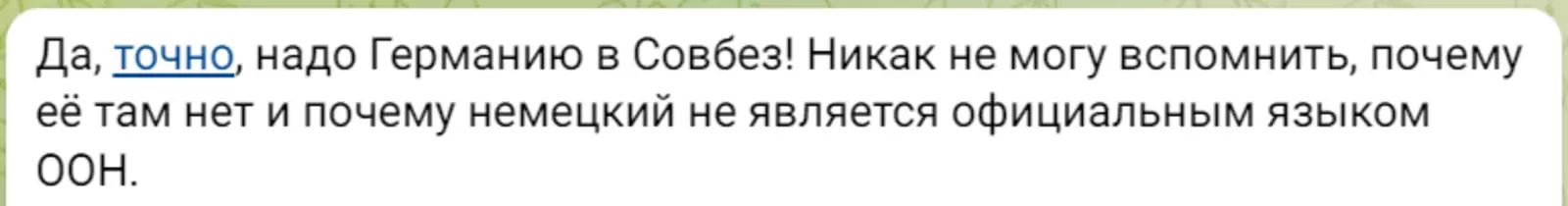 «ООН создавалась после Второй мировой войны странами антигитлеровской коалиции, с какого перепуга Германии должны предоставлять постоянное членство в Совбезе? Олаф на банкете пенного перепил?» — иронизирует адвокат Сталина Гуревич.