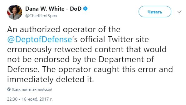 Сотрудник, ответственный за ошибку, заметил ее и сразу же удалил пост, заявила официальный представитель Пентагона Дана Уайт. По ее словам, «авторизованный оператор официального аккаунта Пентагона в Twitter ошибочно ретвитнул контент, который не был бы одобрен Министерством обороны».