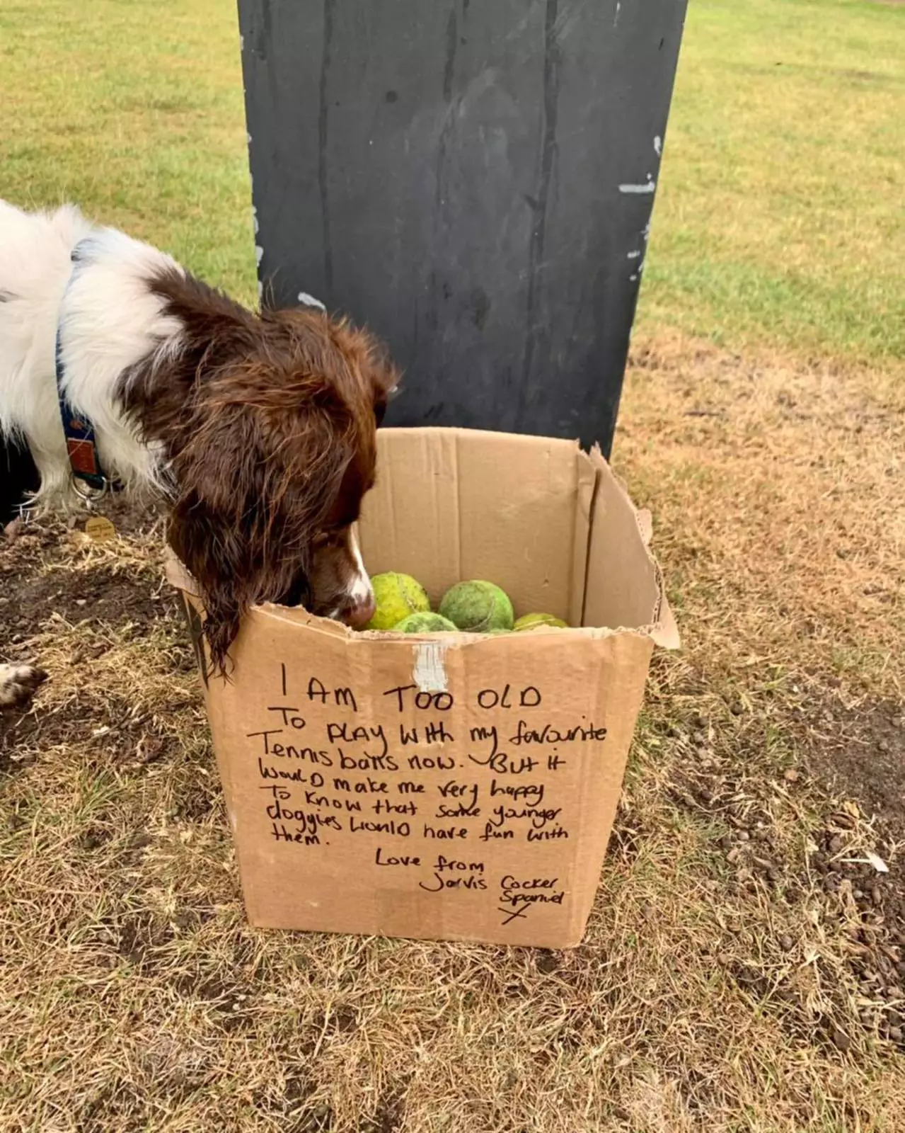 Я слишком стар, чтобы играть с моими любимыми теннисными мячами. Но я был бы счастлив узнать, что более молодые собачки весело проводят с ними время. С любовью, кокер-спаниель Джарвис, — гласила надпись на коробке с мячиками.