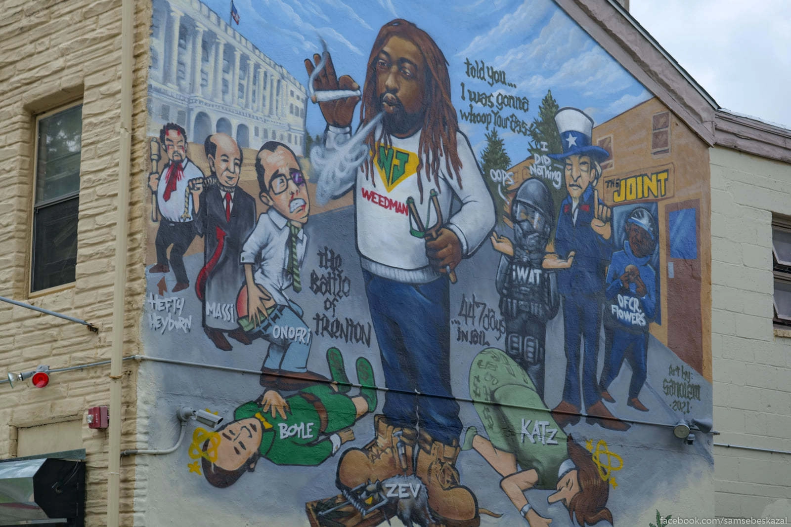 13. Стена с муралом напротив сити-холла на которой изображена борьба Эдварда Форчиона по прозвищу Weedman за легализацию марихуаны. Сам он называет себя активистом и ганджапренером. Форчион в свое время основал партию Легалайза и многие годы боролся за легализацию марихуаны в штате. Когда это произошло законодательно, то он тут же принялся в открытую торговать травой в своем магазине не имея никакой лицензии.