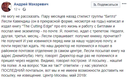 «Директор „Джем-Клуба“ дважды приходил в почтовое отделение для получения этой посылки. Однако в связи с тем, что у него на тот момент не было доверенности от Андрея Макаревича, операторы, согласно закону, не выдали ему посылку», — рассказали в компании.