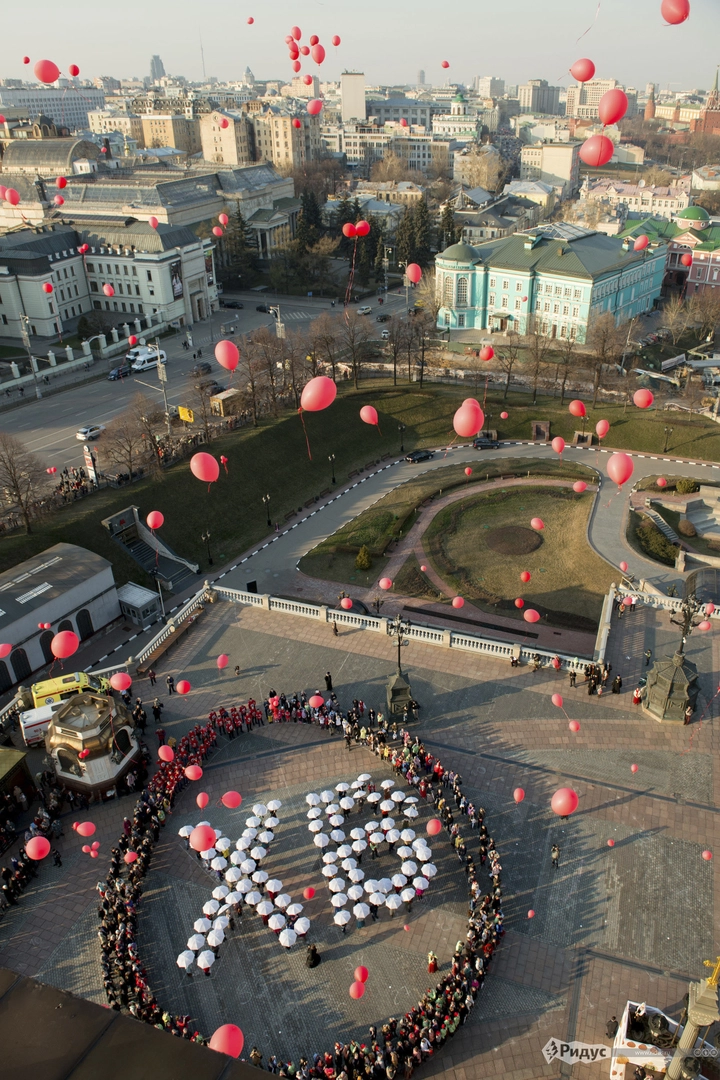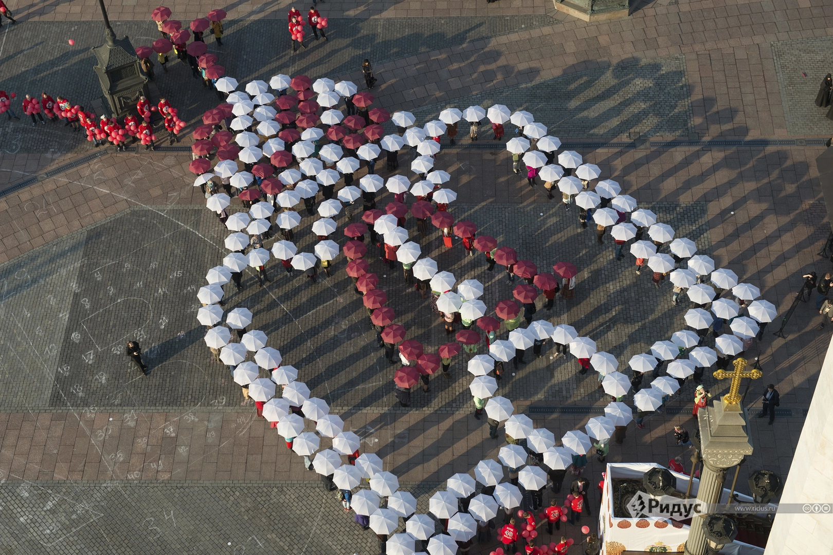Во время поздравления Святейшего Патриарха Кирилла с Пасхой около тысячи человек выстроились с зонтами красного и белого цвета сначала в форме Храма, а позже в форме букв «ХВ» (Христос воскресе). Вокруг в виде пасхального яйца выстроились активисты с воздушными шарами.