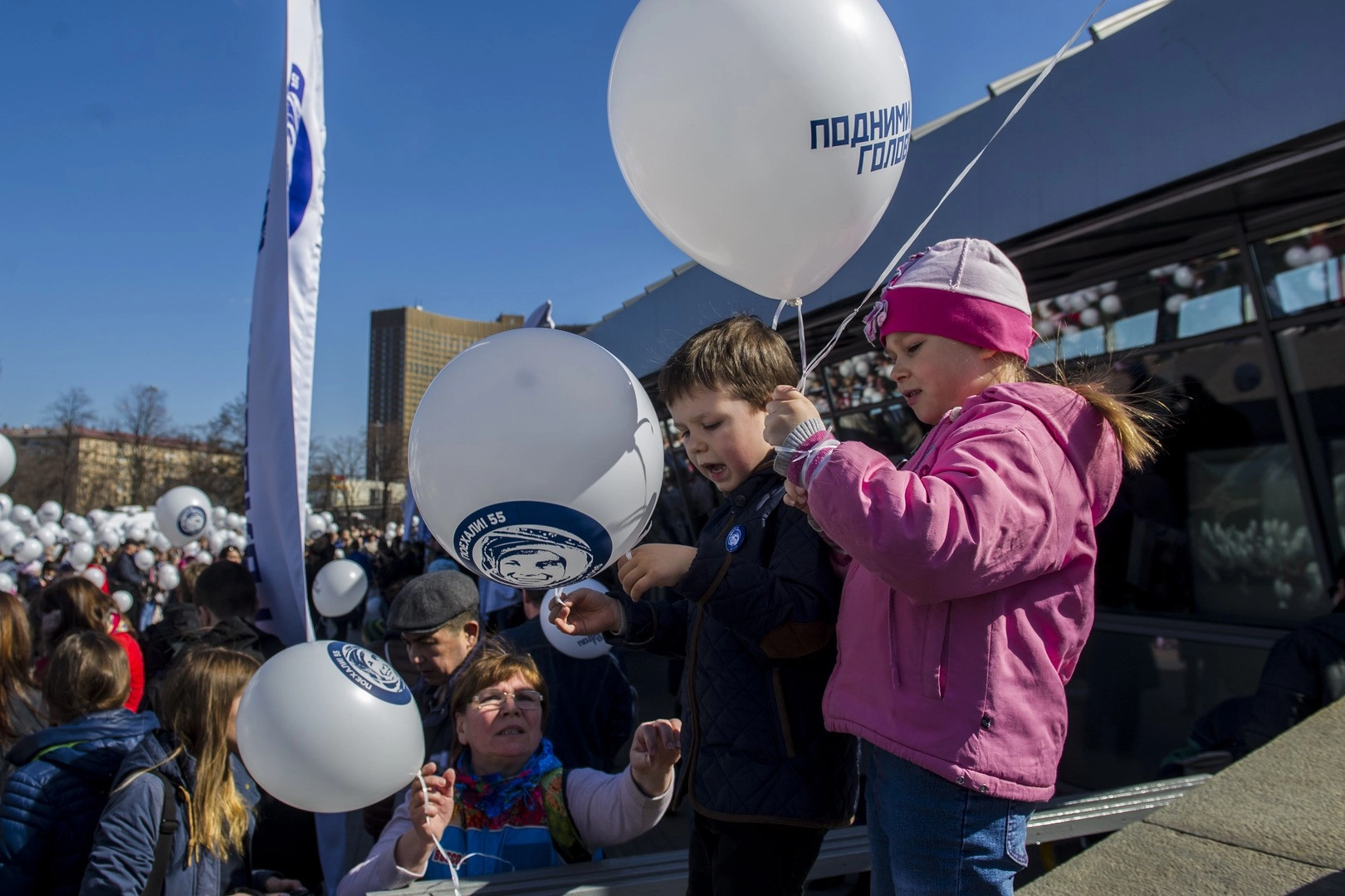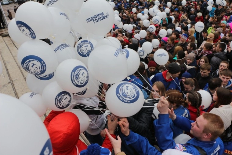 В День космонавтики-2016 массовые мероприятия проходят почти во всех городах Российской Федерации. В честь 55-летия первого полета человека москвичи запустили в небо 55 воздушных шаров, дав старт всероссийскому флешмобу «Подними голову!»