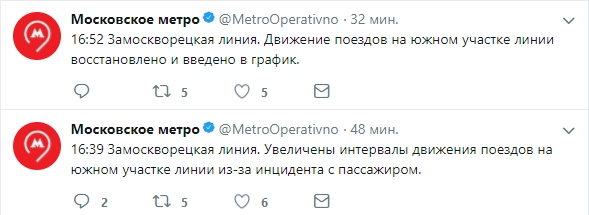 На южном участке Замоскворецкой линии были увеличены интервалы движения поездов. Сейчас движение осуществляется по графику, сообщается в Twitter московского метро.