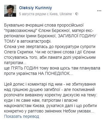 «Буквально вчерашние слова пророссийской „правозащитницы“ Елены Бережной, матери экс-регионалки Ирины Бережной, погибшей час назад в автокатастрофе. Елена уже обращалась в прокуратуру против Олега Скрипки. Едва ли не последние слова и действия Елены касались того, чтобы ломать судьбы украинским патриотам … еще ПЯТЬ ЧАСОВ поэтому она что-то там планировала против украинства НА ПОНЕДЕЛЬНИК …» — писал Куринной в Facebook.