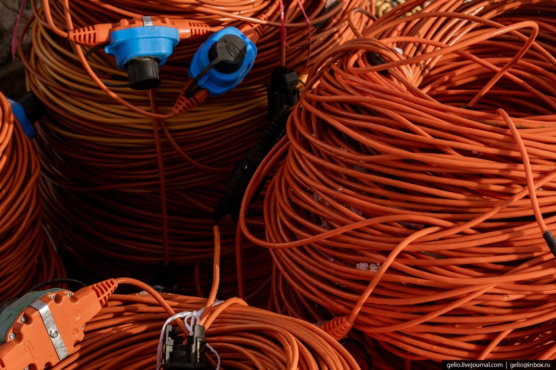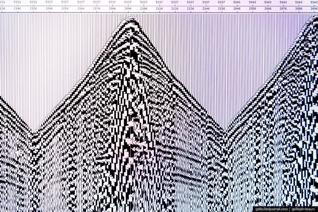 31. «Сейсмокосы». По-научному: четырехканальное звено полевой телеметрической системы сбора данных. Синие коробки — FDU (Field Digital Unit), полевые цифровые модули, каждый из которых — маленький, но мощный компьютер, преобразующий аналоговый сигнал датчиков в цифровую кодовую последовательность и передающий данные по цифровому кабелю в реальном времени с частотой дискретизации 2 мс.