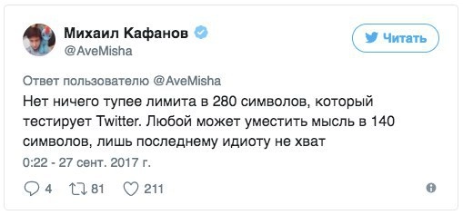 Мы понимаем, что многие из вас пользуются Twitter много лет и уже эмоционально привязались к 140 символам, — мы тоже это чувствуем. Но мы попробовали новую функцию, увидели ее потенциал и влюбились в этот новый ограничитель,пишут представители компании.Однако многие пользователи Twitter саркастично восприняли новое обновление. В Сети уже можно найти посты подобного характера: