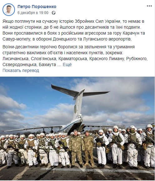 Если взглянуть на современную историю Вооруженных сил Украины, то в ней нет ни одной страницы, где бы не говорилось о десантниках и их подвигах. Они прославились в боях с российским агрессором за гору Карачун и Саур-Могилу, а также при обороне Донецкого и Луганского аэропортов, — написал Порошенко в комментарии к опубликованному снимку.Среди фотографий, приложенных к посту украинского президента, пользователи без труда отыскали коллективный снимок, на котором бронежилет одного из солдат, содержит логотип с нацисткой символикой.