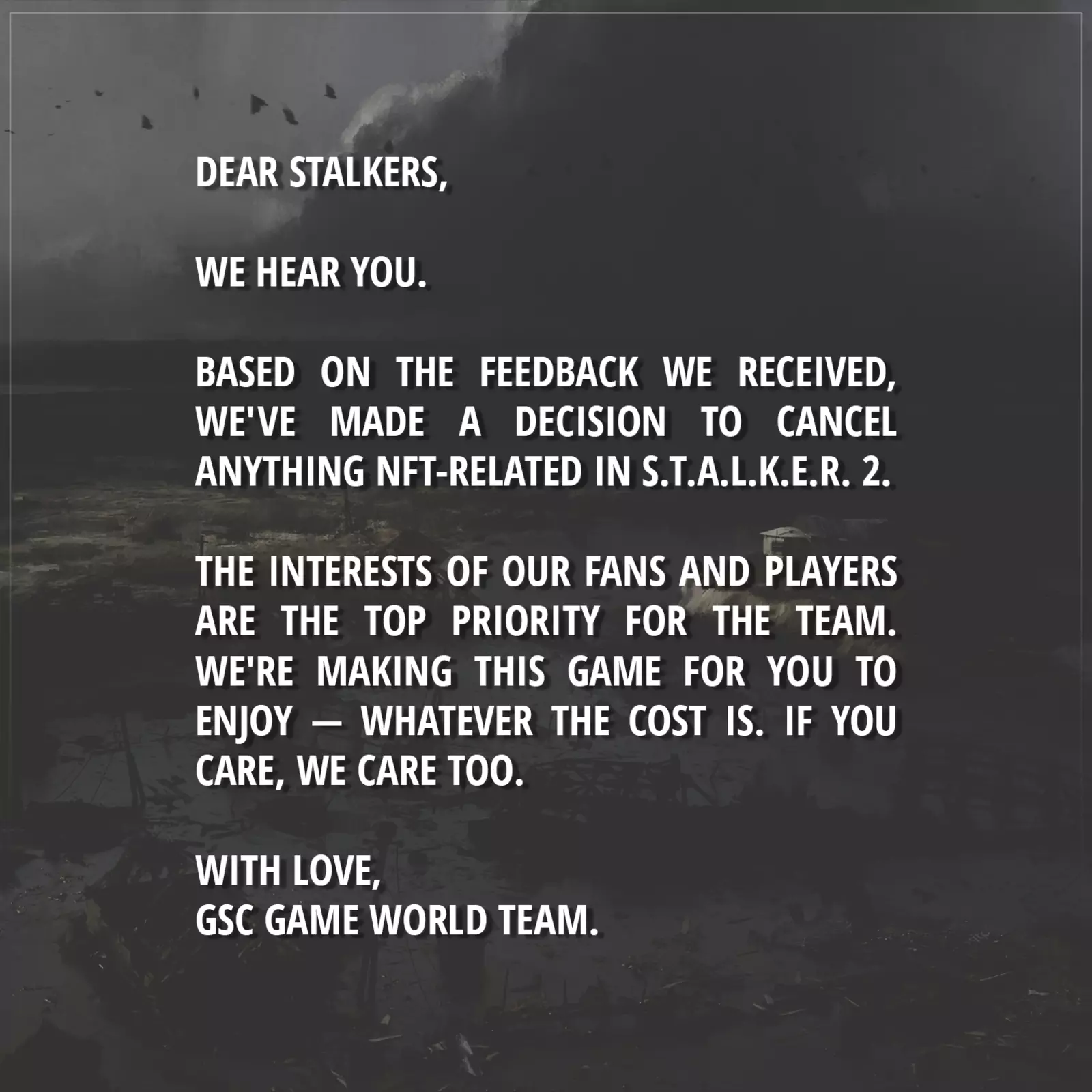 «Мы вас слышим. На основании полученных отзывов мы приняли решение отменить всё, что связано с NFT в S.T.A.L.K.E.R. 2. Интересы наших игроков являются главным приоритетом для команды. Мы делаем эту игру для вас любой ценой», — написали разработчики.