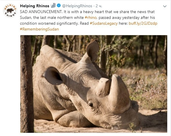 «Печальное объявление. Мы с тяжелым сердцем сообщаем, что Судан, последний самец северного белого носорога, скончался вчера после того, как его состояние значительно ухудшилось», — написали сотрудники организации.