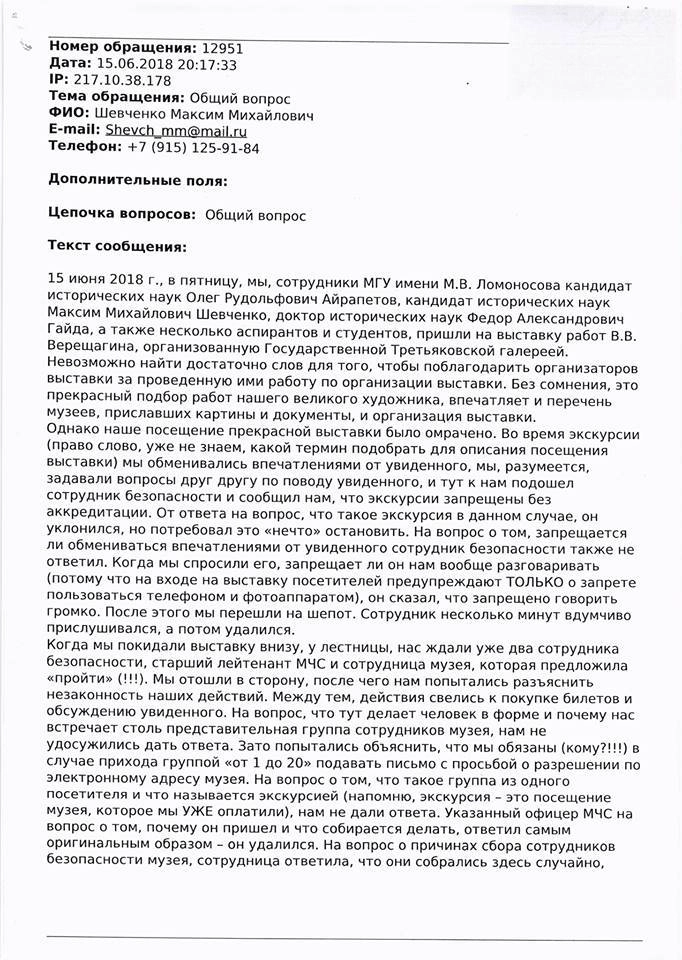15 июня преподаватели Максим Шевченко, Олег Айрапетов, Федор Гайда и несколько аспирантов пришли в галерею на выставку Василия Верещагина. Они обсуждали картины, в этот момент к ним обратились сотрудники безопасности музея с просьбой прекратить экскурсию.