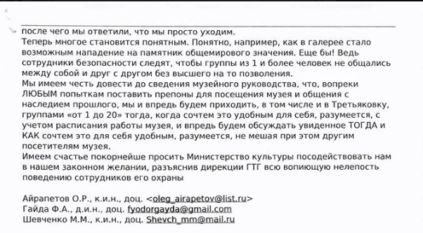 «На вопрос, что тут делает человек в форме и почему нас встречает столь представительная группа сотрудников музея, нам не удосужились дать ответа. Зато попытались объяснить, что мы обязаны (кому?!) в случае прихода группой „от 1 до 20“ подавать письмо с просьбой о разрешении по электронному адресу музея», — сообщил преподаватель.