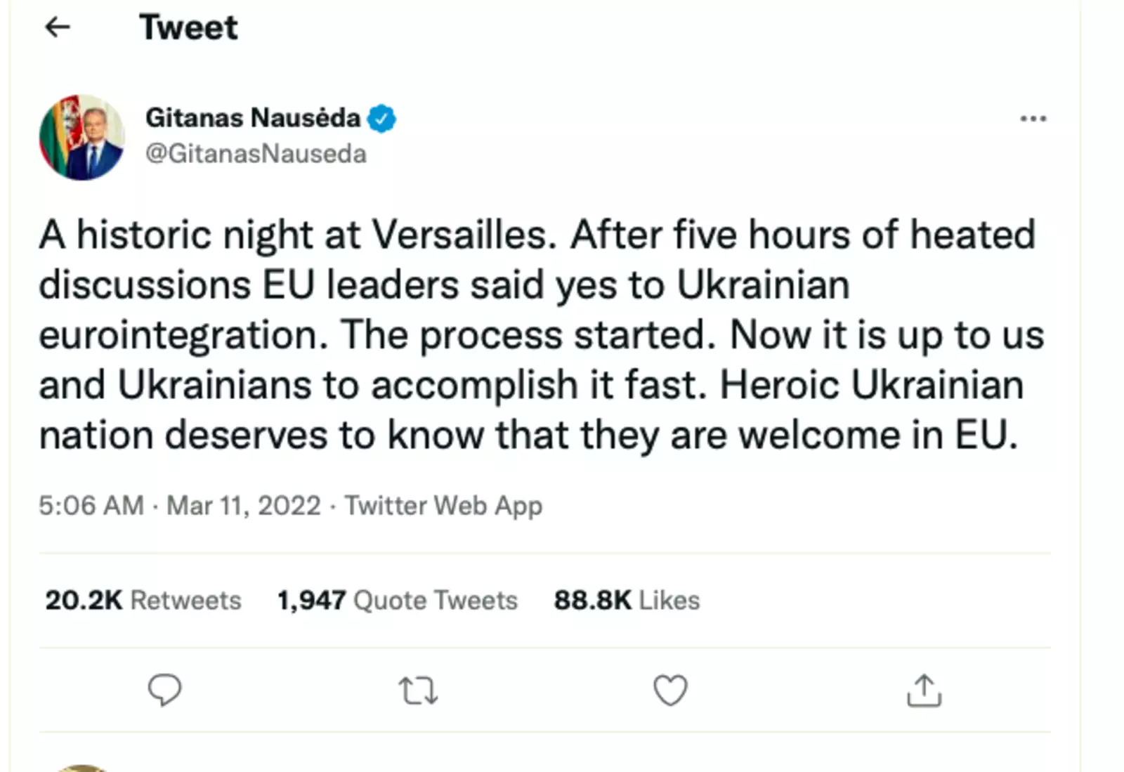 «Историческая ночь в Версале. После пяти часов горячих дискуссий лидеры ЕС согласились на украинскую евроинтеграцию. Процесс начался. Теперь мы и украинцы должны сделать это быстро. Героическая украинская нация заслуживает того, чтобы знать, что она приветствуется в ЕС», — написал Гитанас Науседа.