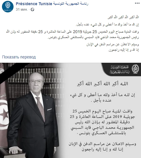«Утром 25 июля 2019 года в 10:25 умер президент Баджи Каид Эс-Себси в военном госпитале», — говорится в сообщении канцелярии на странице в Facebook.