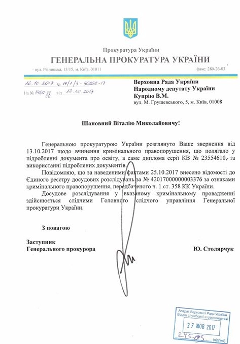 Однако мне было отказано в открытии уголовного производства,написал нардеп в своем Facebook.Спустя полтора года ему поступил документ из Генпрокуратуры, в котором сообщалось, что дело о подделке диплома внесено в Единый реестр досудебных расследований.