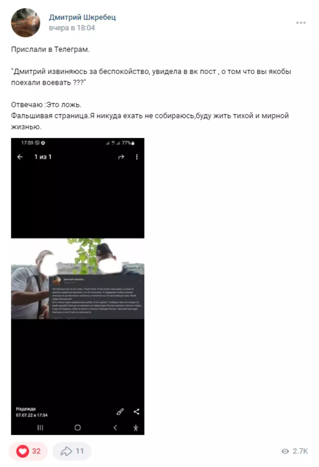 7 июля Шкребец столкнулся с очередным фейком: от его имени распространили сообщение, что он уходит на Украину воевать в так называемом легионе «Свобода России», в который принимают россиян, желающих «бороться с режимом» в рядах украинской армии. Но отец матроса опроверг это сообщение.