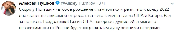 Скоро у Польши — „второе рождение“: там только и речи, что к концу 2022-го она станет независимой от российского газа, — написал Пушков в своем микроблоге в Twitter.Ранее представитель Польши по вопросам стратегической энергетической инфраструктуры Петр Наимский заявил, что к концу 2022 года страна полностью откажется от газа из РФ, отмечает ФАН.