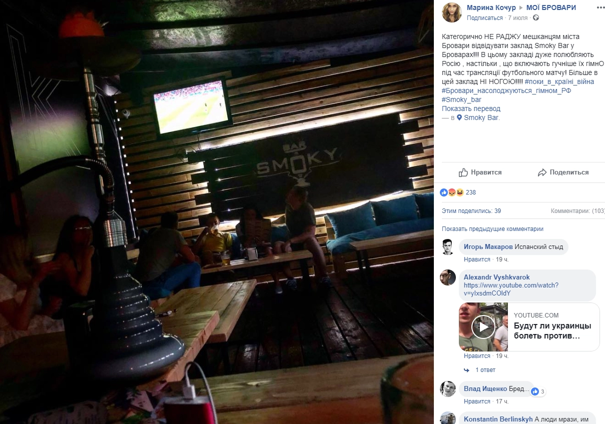 «Категорически не советую жителям Броваров посещать заведение Smoky Bar. Там очень любят Россию. Настолько, что включают погромче их гимн во время трансляции футбольного матча», ― написала девушка.