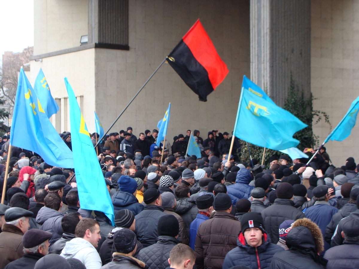 26 февраля в Симферополе у Верховного совета республики собрались сторонники новых украинских властей и крымские татары. Люди скандировали лозунги «Крым — не Россия!» и «Слава Украине! Героям слава!».
