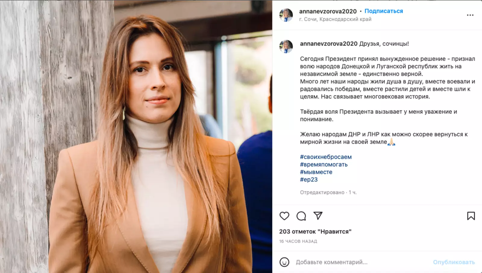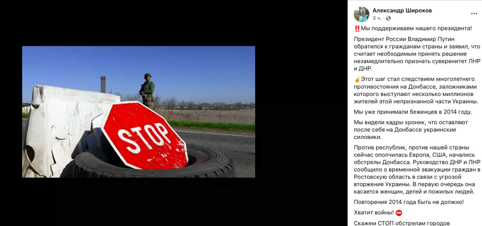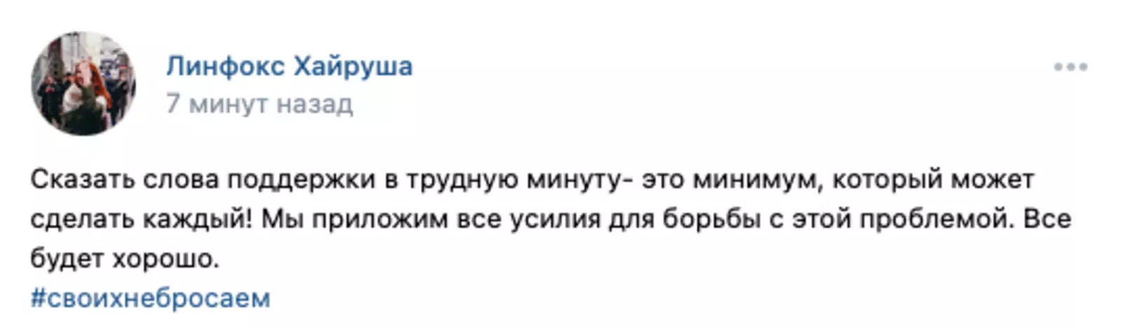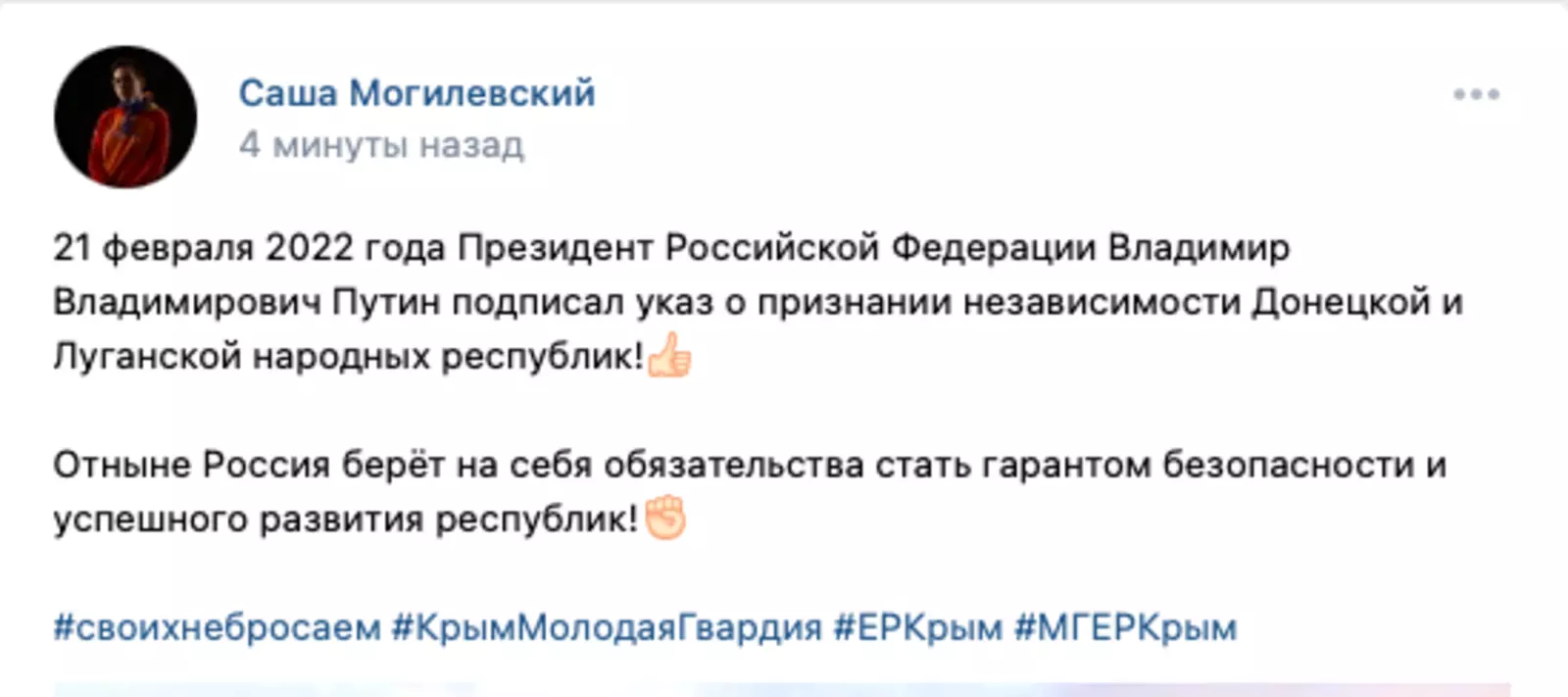 В России стартовал флешмоб, посвященный решению президента Владимира Путина о признании Луганской и Донецкой народных республик. Люди размещают в социальных сетях посты со словами поддержки, сопровождая свои публикации хэштегами #СвоихНеБросаем, #МыВместе.