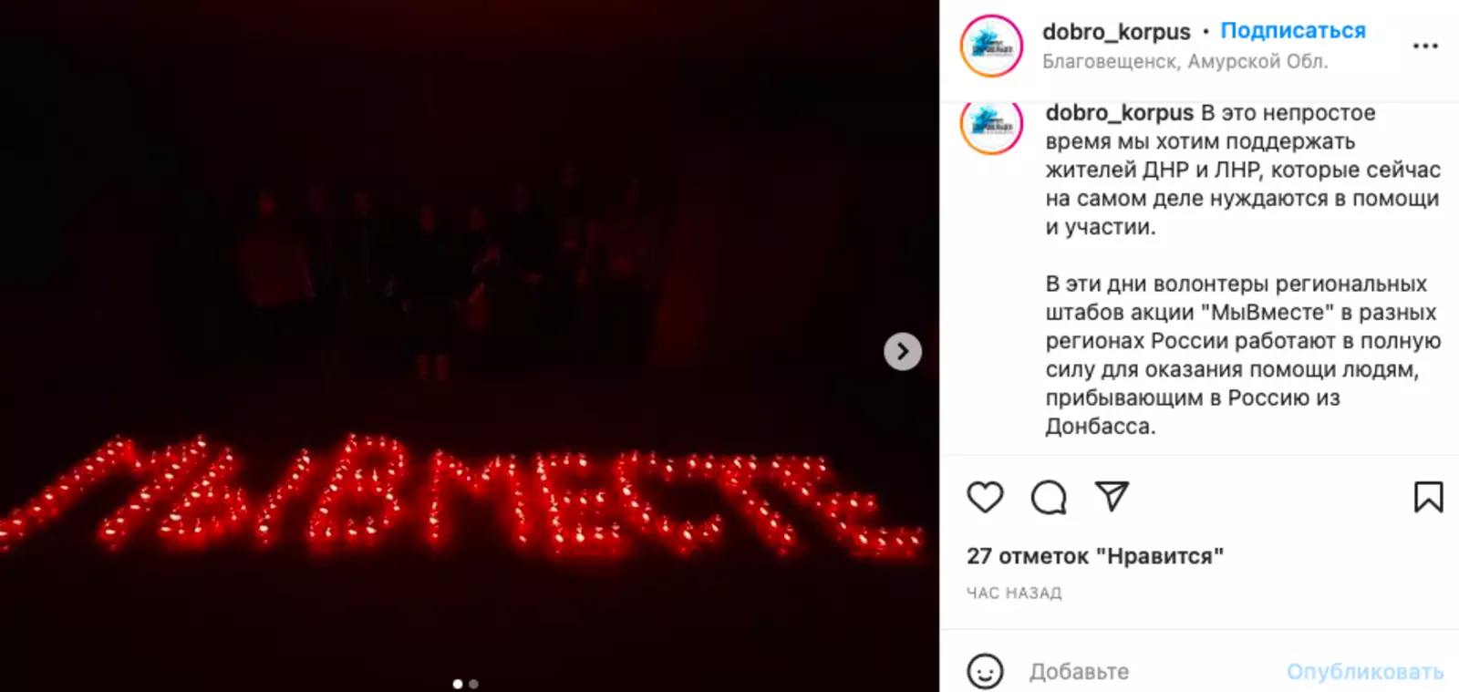В Благовещенске волонтеры молодежного центра «Выбор», представители «Молодежки ОНФ» и «Молодой гвардии Единой России» зажгли свечи в виде хэштега #МыВместе", чтобы выразить поддержку жителям Донбасса.