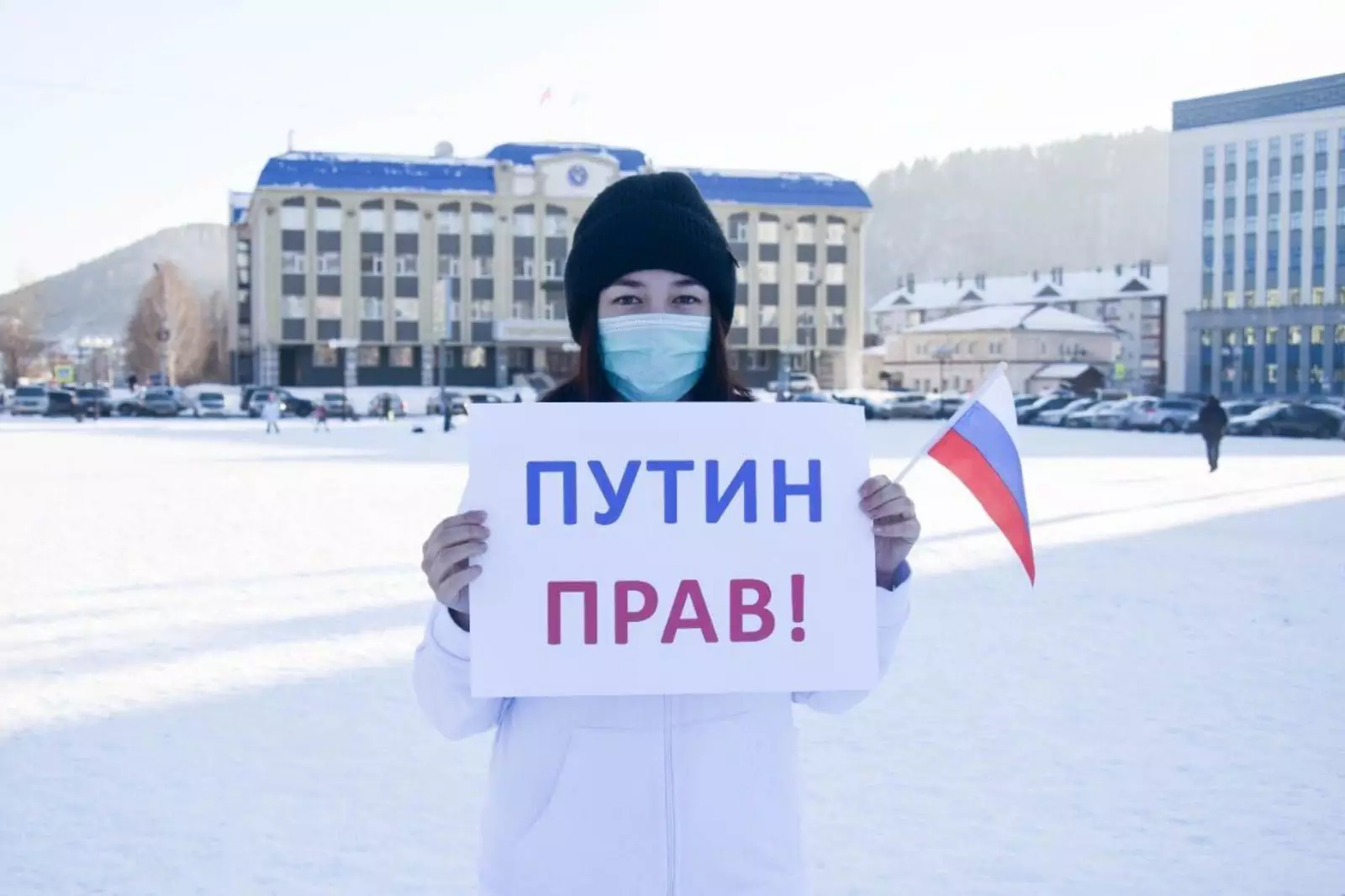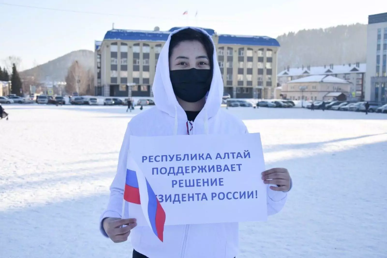 Также молодежь вышла на центральную площадь Горно-Алтайска с плакатами «Путин прав!», «Республика Алтай поддерживает решение президента России!».