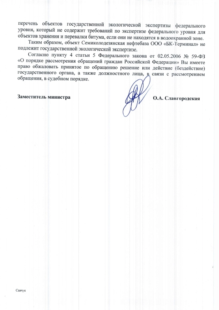 В свою очередь, Росприроднадзор, ссылаясь на нормы федерального закона от 23.11.1995 № 174-ФЗ «Об экологической экспертизе», сообщил о том, что Семиколодезянская нефтебаза не подлежит государственной экологической экспертизе, поскольку объект не находится в водоохранной зоне.