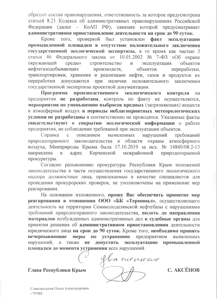 Осенью прошлого года Сергей Аксёнов обратился к республиканскому прокурору с требованием принять исчерпывающие меры по устранению выявленных нарушений. В обращении говорилось о требованиях Федерального закона от 10.01.2002 № 7-ФЗ «Об охране окружающей среды» осуществлять строительство и эксплуатацию объектов транспортировки, хранения и реализации нефтепродуктов при наличии государственной экспертизы проектной документации.