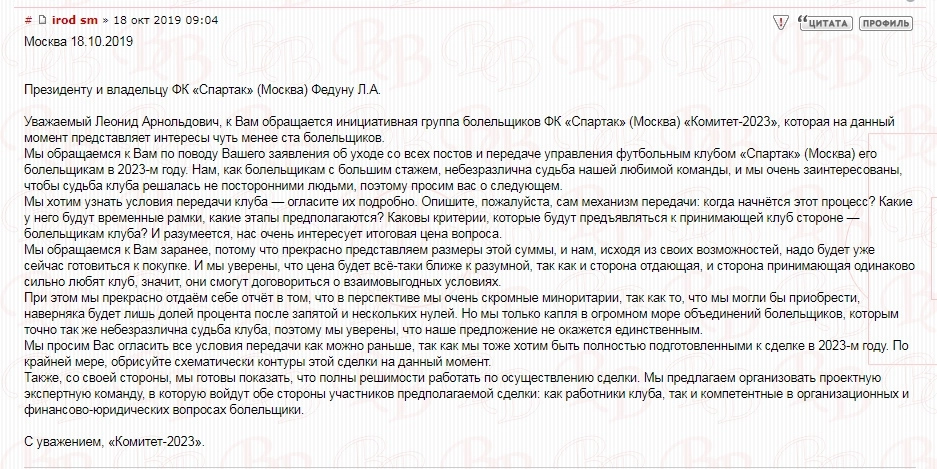 «Но если, не дай бог, мы ошибаемся, и все это — лишь разговоры о передаче или продаже, и ничего, по сути, не изменится, то мы приложим дополнительные усилия, насколько это возможно в условиях гражданского правового законодательства. Чтобы решительно помешать тем силам, которые будут строить препоны устремлению Леонида Арнольдовича Федуна передать управление в другие руки. Леонид Арнольдович, мы с Вами!» — резюмировал представитель «Комитета 2023».