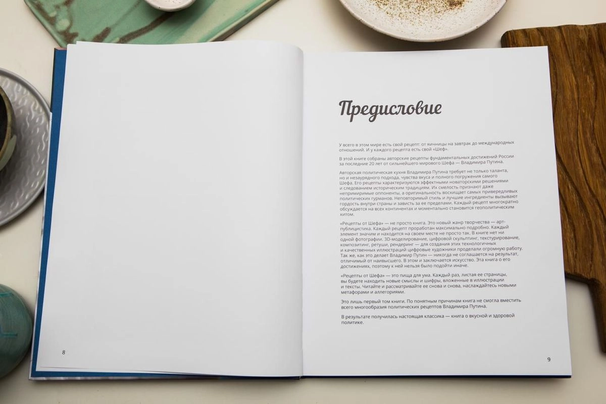 Ко дню рождения президента России Владимира Путина в книжных магазинах столицы появились в продаже «Рецепты от Шефа» — книга о главных достижениях главы государства за последние 20 лет, представленных в формате сборника рецептов.