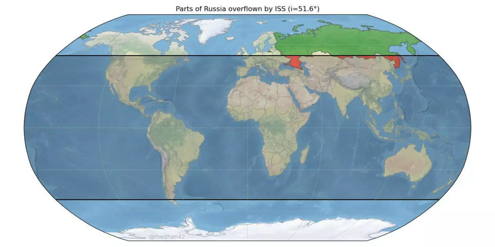 Сообщение в Telegram-канале Рогозина проиллюстрировано картой возможных районов падения МКС в случае неконтролируемого схода с орбиты.