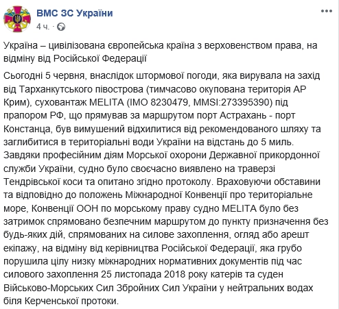 «Учитывая обстоятельства и в соответствии с положениями Международной конвенции о территориальном море, Конвенции ООН по морскому праву судно MELITA было без задержек направлено безопасным маршрутом в пункт назначения», — отмечается в сообщении ВМСУ.