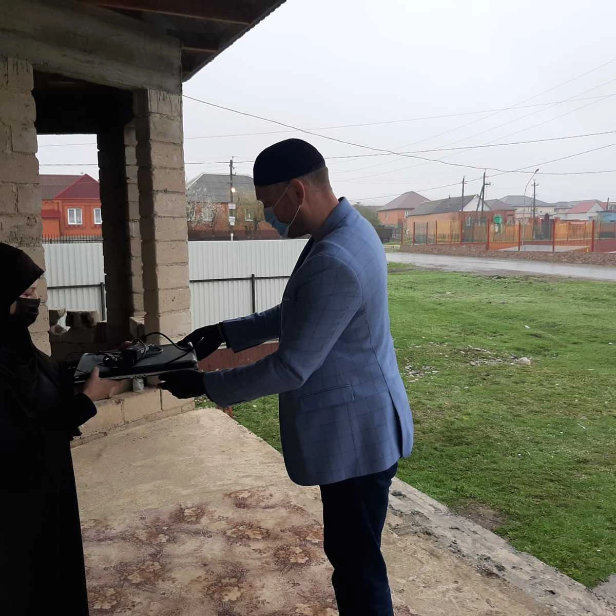 На фотографии ниже изображено, как волонтеры вручают многодетной семье Евлоевых из селения Али-Юрт (Ингушетия) поддержанный ноутбук. Оба родителя не так давно лишились работы из-за экономического кризиса.