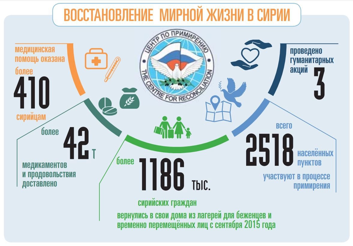 «Вернулись в свои дома из лагерей для беженцев и временно перемещенных лиц с сентября 2015 года 1,186 тысячи сирийских граждан», — следует из инфографики, опубликованной в газете Минобороны РФ «Красная звезда».
