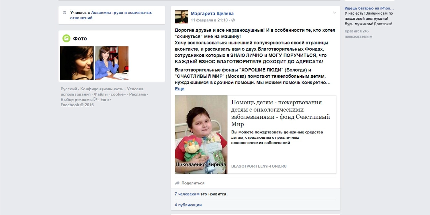 «Дорогие друзья и все неравнодушные! И в особенности те, кто хотел скинуться мне на машину! Хочу воспользоваться нынешней популярностью своей страницы Вконтакте и рассказать вам о двух благотворительных фондах», — написала Щелева на свой страничке в Facebook.