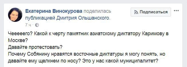 «Мы, нижеподписавшиеся граждане Российской Федерации, выражаем свое крайнее недовольство решением мэра Москвы Сергея Собянина по установке в российской столице за счет бюджета города Москвы памятника первому президенту Узбекистана Исламу Каримову. Хотим напомнить, что Ислам Каримов является символом среднеазиатской русофобии, беззакония и узурпации власти. В период президентства Ислама Каримова в Узбекистане безнаказанно совершались акты агрессии по отношению к русскоязычным жителям данной республики», — сказано в петиции, опубликованной 29 октября 2017 года на Change.org.