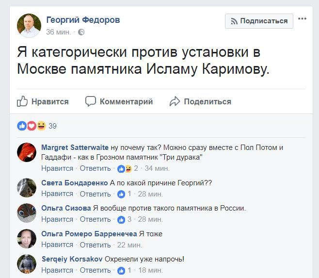 В Рунете набирает обороты недовольство решением московских властей установить памятник первому президенту Узбекистана Исламу Каримову. За три дня почти четыре тысячи человек открыто высказали свой протест, подписав соответствующую петицию, другие оставили негативный отзыв в своих блогах и страницах в социальных сетях.