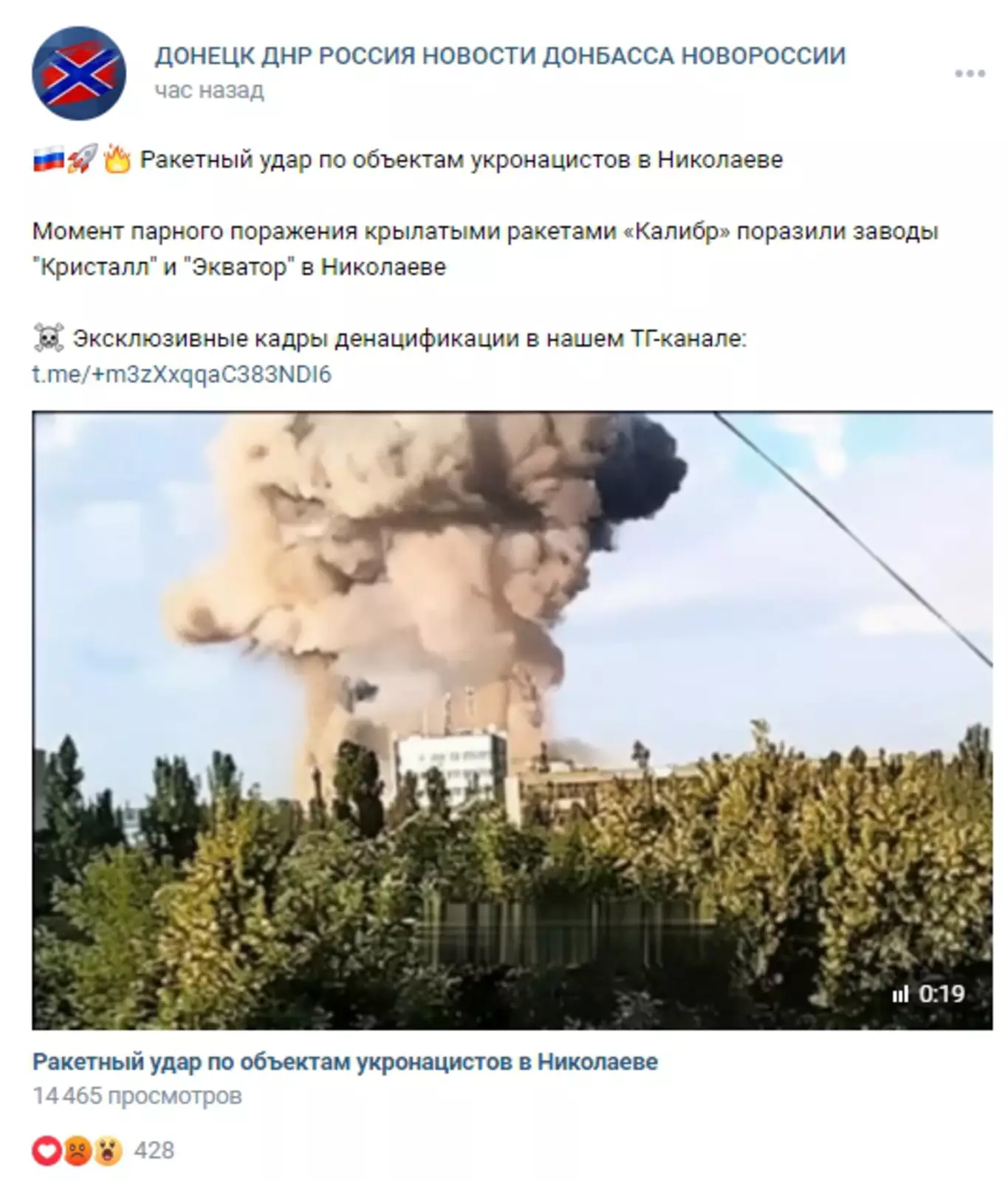 Ранее в российских соцсетях и Telegram-каналах появилось видео удара крылатыми ракетами «Калибр» ВС РФ по двум объектам в Николаеве. Целью удара были заводы «Кристалл» и «Экватор».