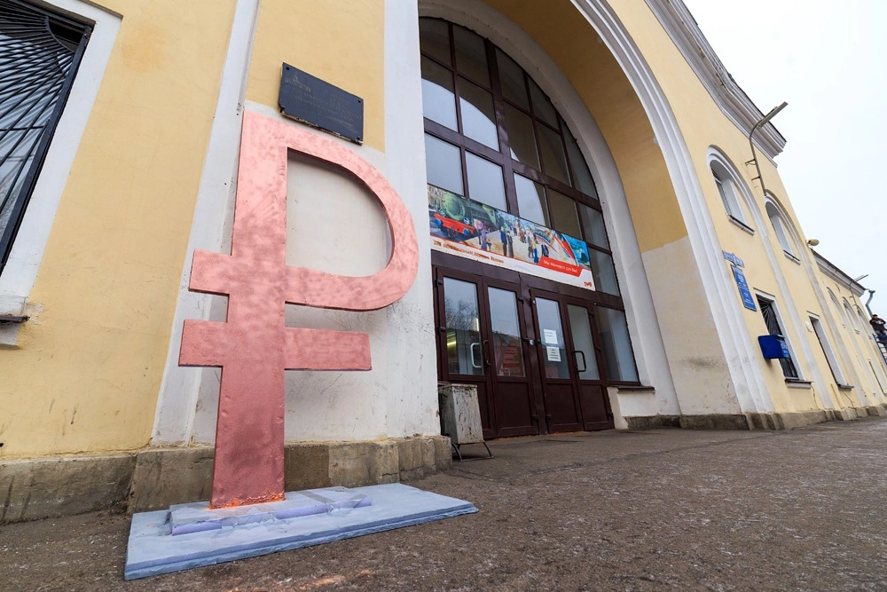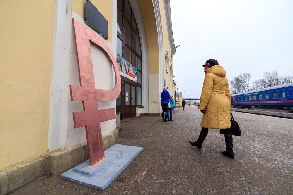 Знак рубля доставили в город Дно Псковской области и установили на одноименной станции. Символ российской национальной валюты высотой около двух метров подпирает одну из стен здания вокзала.