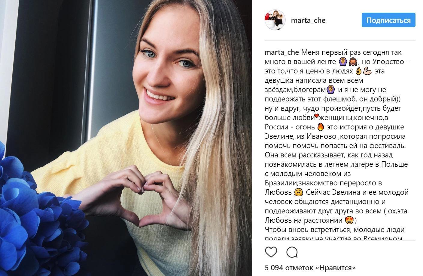 Актриса Анна Хилькевич, певица Нюша, ведущая «Дома-2» Ксения Бородина и другие российские звезды и популярные блогеры запустили в Рунете флешмоб #ПустиЛюбовьНаФестиваль, его цель — помочь встретиться в Сочи девушке Эвелине из города Иваново и молодому человеку из Бразилии, которые влюбились друг в друга в летнем лагере в Польше в прошлом году.